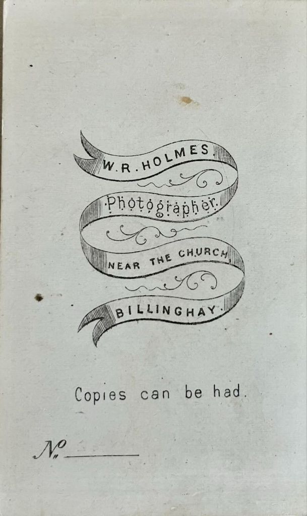 With limited information, apart from a name and address, the photographer had premises near the church in Billinghay. I gambled on the first name being William, and a search located William Robinson Holmes, another search on Ancestry found one man, William Robinson Holmes, born in 1846 and baptised in Billinghay on 30 Aug 1846, the son of John and Elizabeth Holmes. A search on GRO confirmed William’s middle name is his mother’s maiden name, Robinson. John Holmes married Elizabeth Robinson on 21 November 1844 at St Andrew’s church, Potterhanworth, Lincolnshire. In 1851 John was a plumber, glazier and painter.
