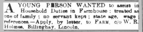 Before 1897 they had moved out of the village and were now living on Tattersall Road, North Kyme on the 1901 census. William continued to have his own account with his newsagent and decorating business. It was interesting to find this advertisement for a ‘Young Person’ in the Lincolnshire Chronicle dated 18 May 1906.