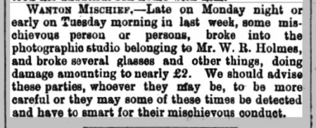 The breakthrough came following a search of the Directories, in the 1876 Kelly’s directory the entry revealed William Robinson Holmes – photographer and paper hanger. Subsequent entries confirmed William was a painter and house decorator. This was definitely our man.