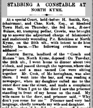 At a special court hearing held at Sleaford Town Hall on Thursday 3 October 1901, we get to hear more details about the stabbing of PC Retchless, it states North Kyme but the Coach and Horses Pub is in Billinghay but on North Kyme/Tattershall Road. The following newspaper report was in the Sleaford Gazette – Saturday 05 October 1901.