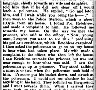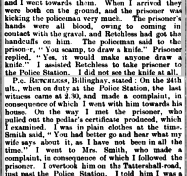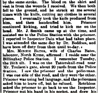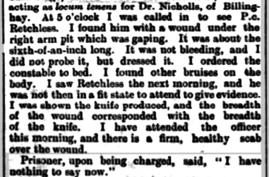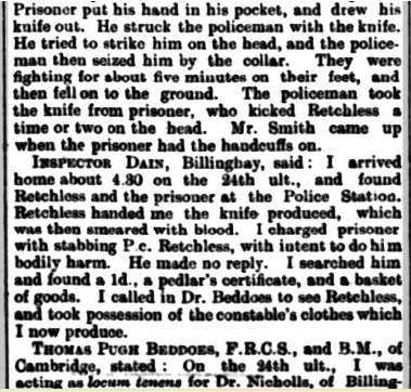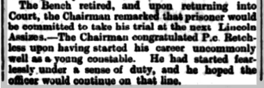 On Tuesday 24 September 1901. A KESTEVEN CONSTABLE STABBED. At a special session at Sleaford yesterday, Robert Wilson, hawker, of Crowle, was charged with stabbing Police-constable Retchless Billinghay the previous night. The officer was fetched to eject Wilson from the Coach and Horses Inn, Billinghay, where he had been creating a disturbance, and upon endeavouring to take Wilson into custody drew a knife and stabbed Retchless in the arm, groin, and chest.āDr. Thomas Beddoes having given evidence. Superintendent Taylor asked for remand for eight days.āMr. C. Kirk, the chairman, granted the remand, and the prisoner’ removed to Lincoln.
