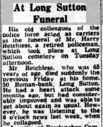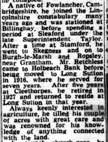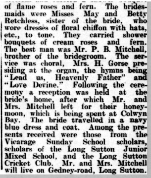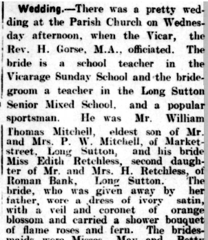 I found a lovely report of Edith’s wedding in the newspaper archives with her two sisters as her bridesmaids. She was married in the parish church of Long Sutton, Lincolnshire about 30 miles from Billinghay and where the family lived after Harry Retchless retired from the Police. He was a smallholder and the family owned a few acres. It was close to where he grew up at Tydd St Giles.