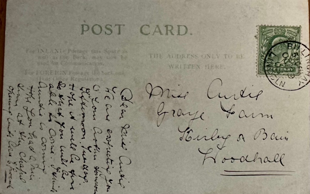 A postcard dated Oct 29 1905 was sent from Billinghay, Lincolnshire to Miss Curtis, of Grange Farm, Kirkby on Bain, Woodhall. My curiosity raised the question of who sent the postcard, and who was Miss Curtis?.