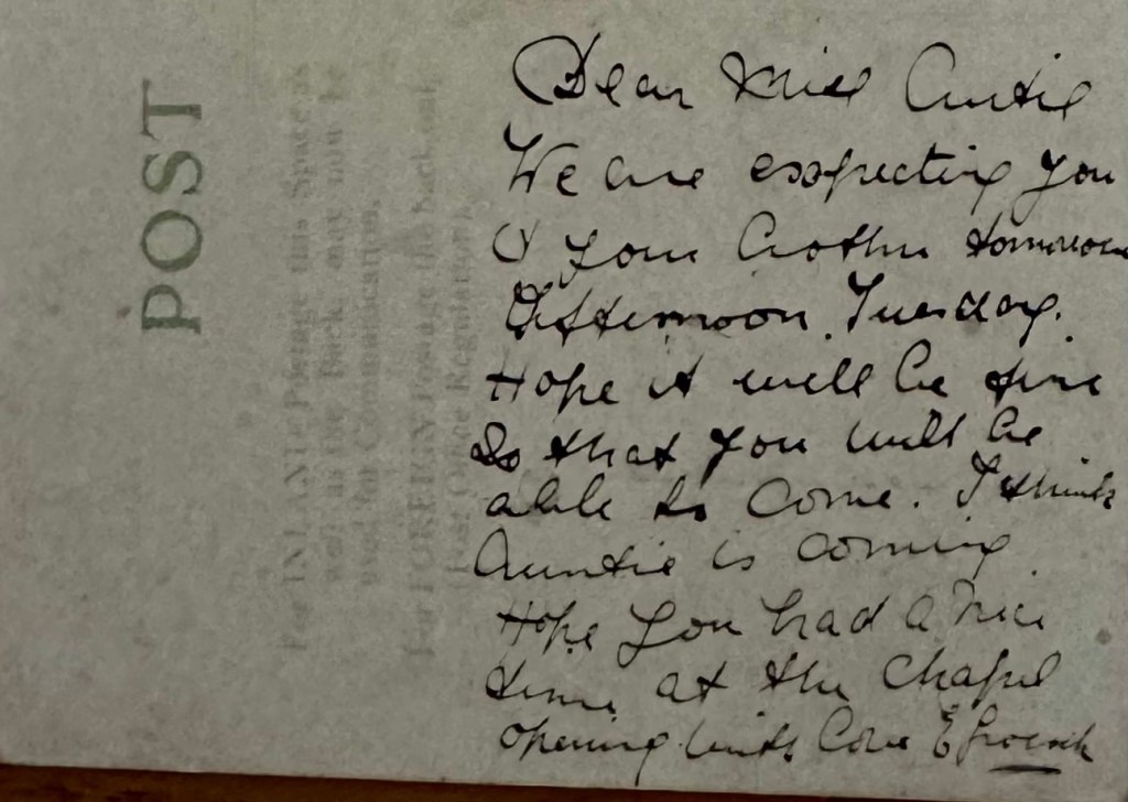 The card read: “Dear Miss Curtis. We are expecting you & your brother tomorrow afternoon, Tuesday. Hope it will be fine so that you will be able to come. I think Auntie is coming. Hope you had a nice time at the Chapel opening. With love E French“