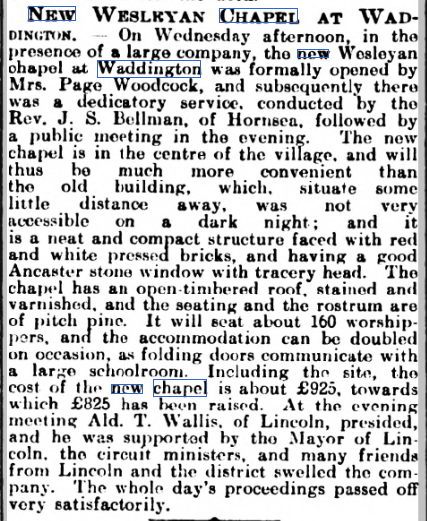 The hunch paid off as recorded in the Stamford Mercury Friday 13 October 1905 was the opening of the Chapel on 11th October 1905 at Waddington, Lincolnshire. Whilst there are no clues to the attendees to this opening, the fact the dates do tie in offers a possible connection.
