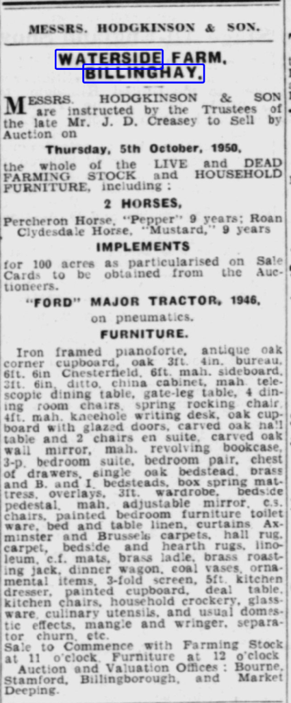 My next mission was to determine who owned Waterside? and how could they afford a property of this size in rural Lincolnshire. The 1901 census reveals the occupants to be the Creasey family, the head of the household was farmer/employer John and his wife Alice Creasey. In the census living with them was their daughter Kate aged 20 and two sons John aged 21 and Joseph aged 17.