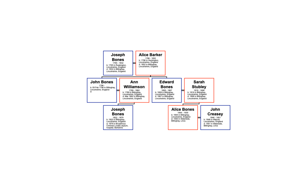 A blog I did on 31 October 24 – “A Murder most Horrid in Billinghay” details the horrific murder committed by Joseph Bones. My immediate thoughts now turned to the possibility Alice Creasey nee Bones may be related to Joseph.