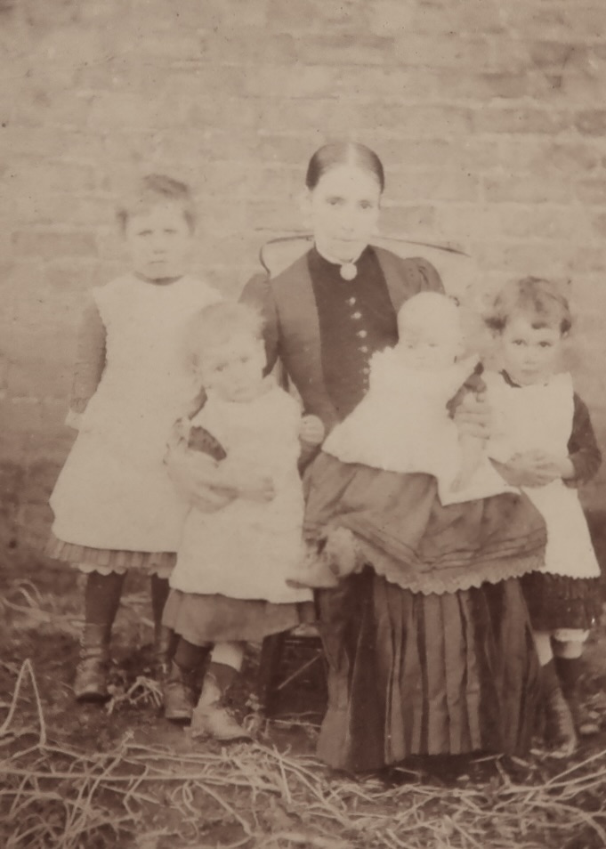 My GGM Harriet Holmes nee Watson sister of the bride’s mother, with her 4 oldest children, c.1885, including my grandmother Jane.