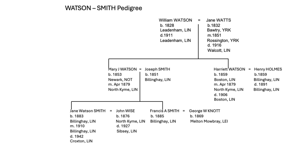 Determined to confirm this was definitely linked to my family, I searched my own personal family tree and there was the mother of the bride,  Mary Jane Watson, my now-known great-aunt and the elder sister of Harriett Watson my great-grandmother. Mary Jane married Joseph Smith in 1879 in Billinghay, firmly placing the bride Jane Watson-Smith within my own family tree.