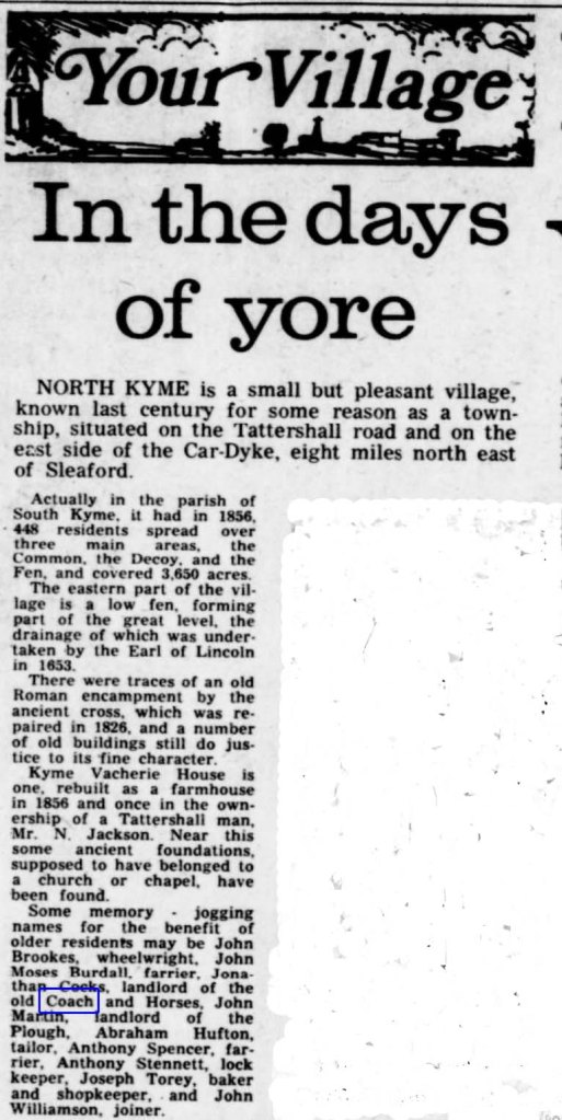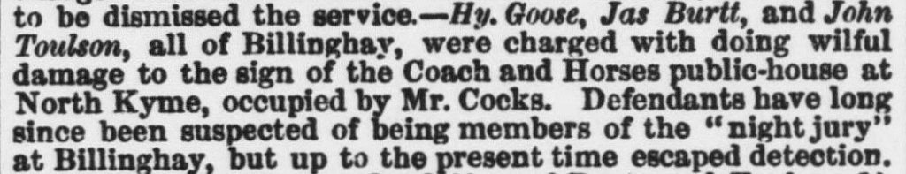 1856 – Mr Jonathan Cocks tenure is confirmed in the Stamford Mercury 26 Sept 1856 when a report of damage to the sign of the Coach & Horses saw three local men convicted of the said crime.