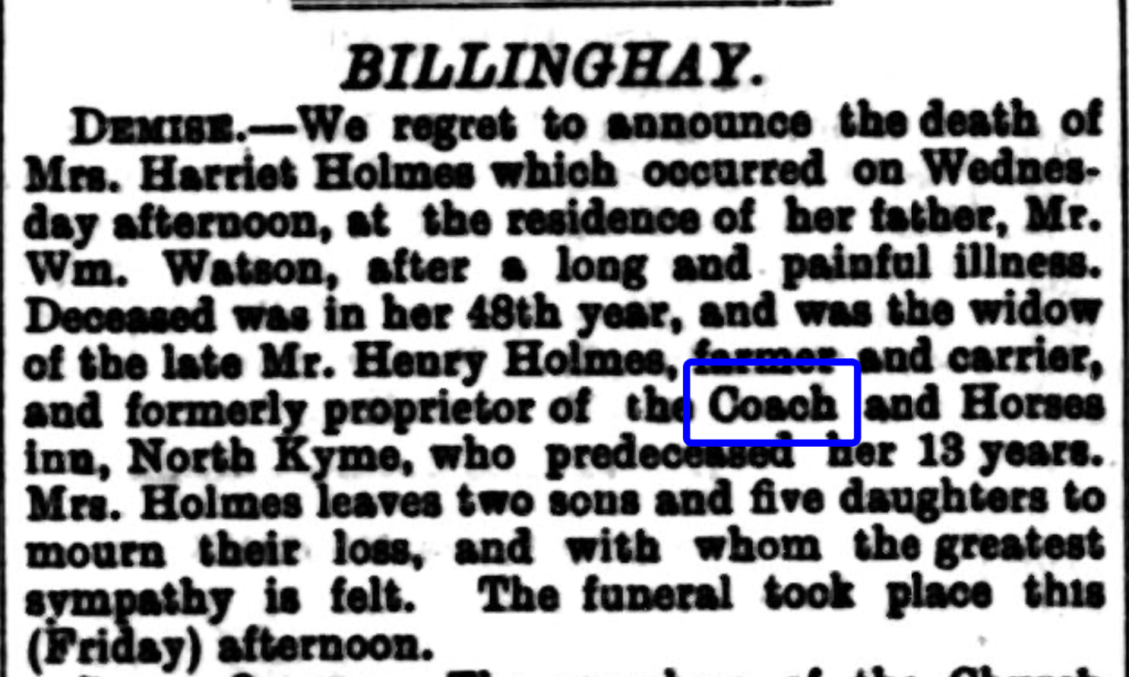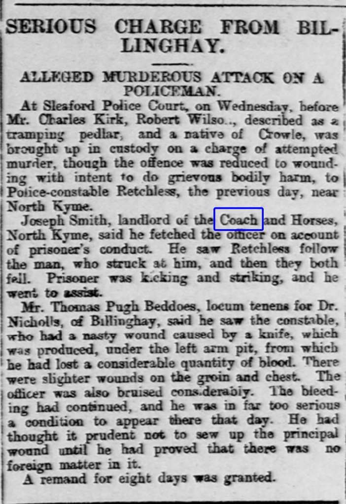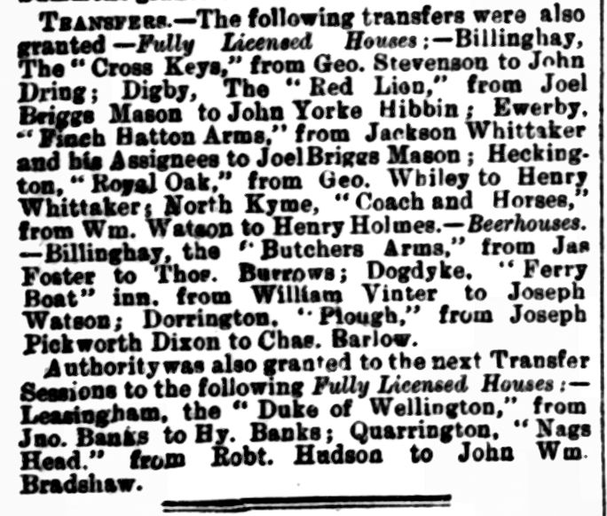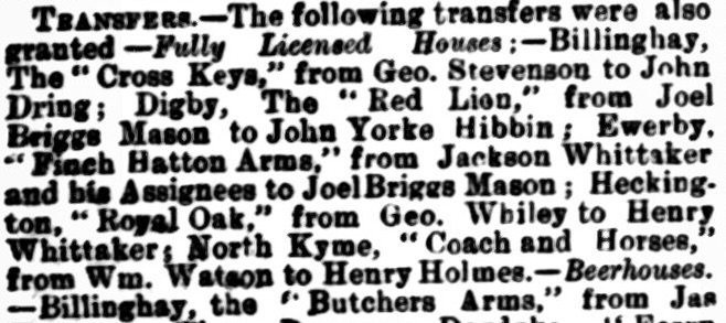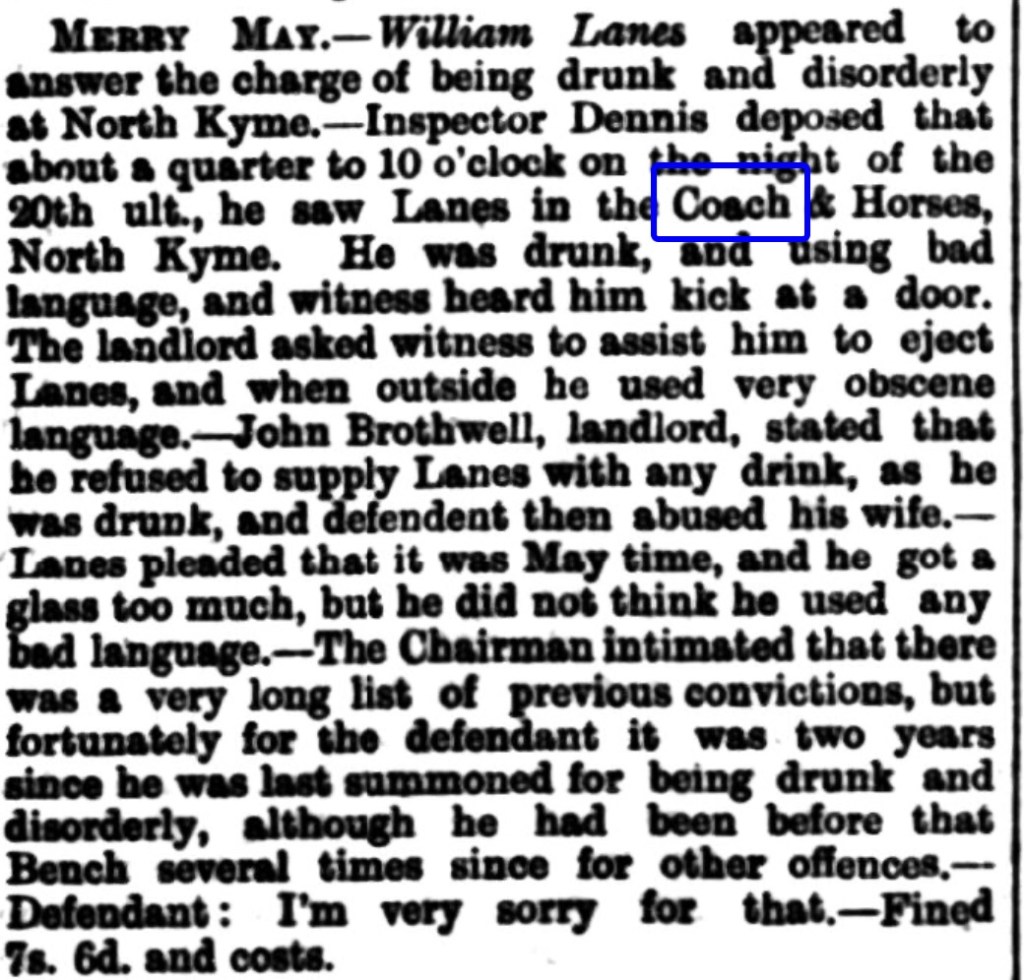 Transfer of the licence is confirmed in the Sleaford Gazette, 12 April 1890, when the Coach and Horses was transferred from William Watson to Henry Holmes.
