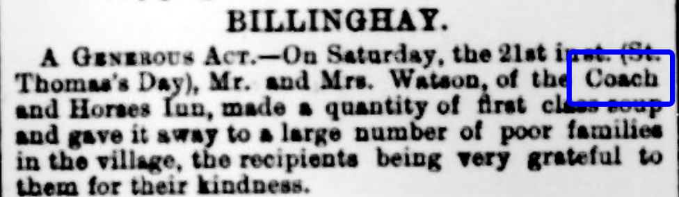 1881. In the 1881 census, William Watson was the Innkeeper at the Coach and Horses Public House in Billinghay village, he was also the village butcher. Recorded in the Grantham Journal on 10 June 1882, William was still running the pub. Recorded in the Sleaford Gazette 9 Dept 1889, William was still recorded being the innkeeper.