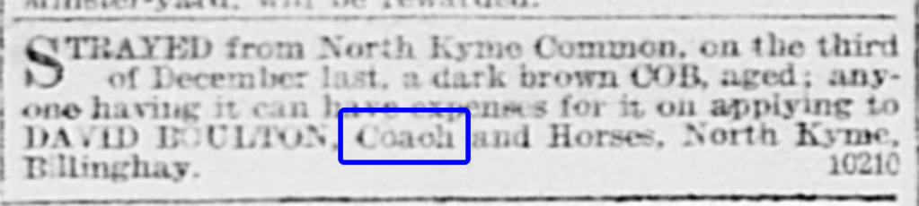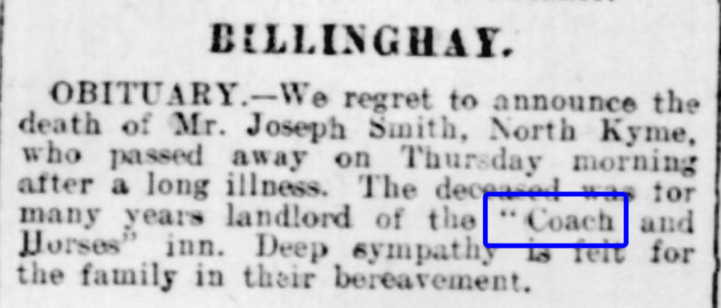 Joseph Smith died Dec 1913, and his obituary in the Lincoln Leader & County Advertiser records his tenure of the Coach & Horses.