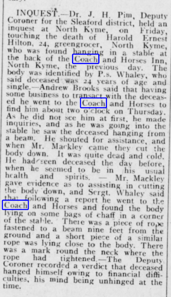 1891. Unfortunately, Henry was not the landlord for very long; he died prematurely aged just 36, in December 1891 of TB. His ownership of the Coach & Horses was again confirmed in his obituary reported in the Sleaford Gazette 18 Jan 1891.