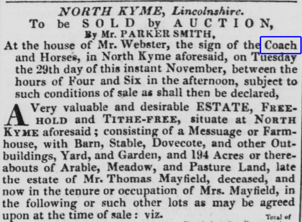 Mary died in 1841, however, the Coach & Horses remained in the family, as the next entry confirms. In the Stamford Mercury, 18 Nov 1831, locates a Mr Webster, not having his first name, I was unsure of his relationship to Mary Webster.