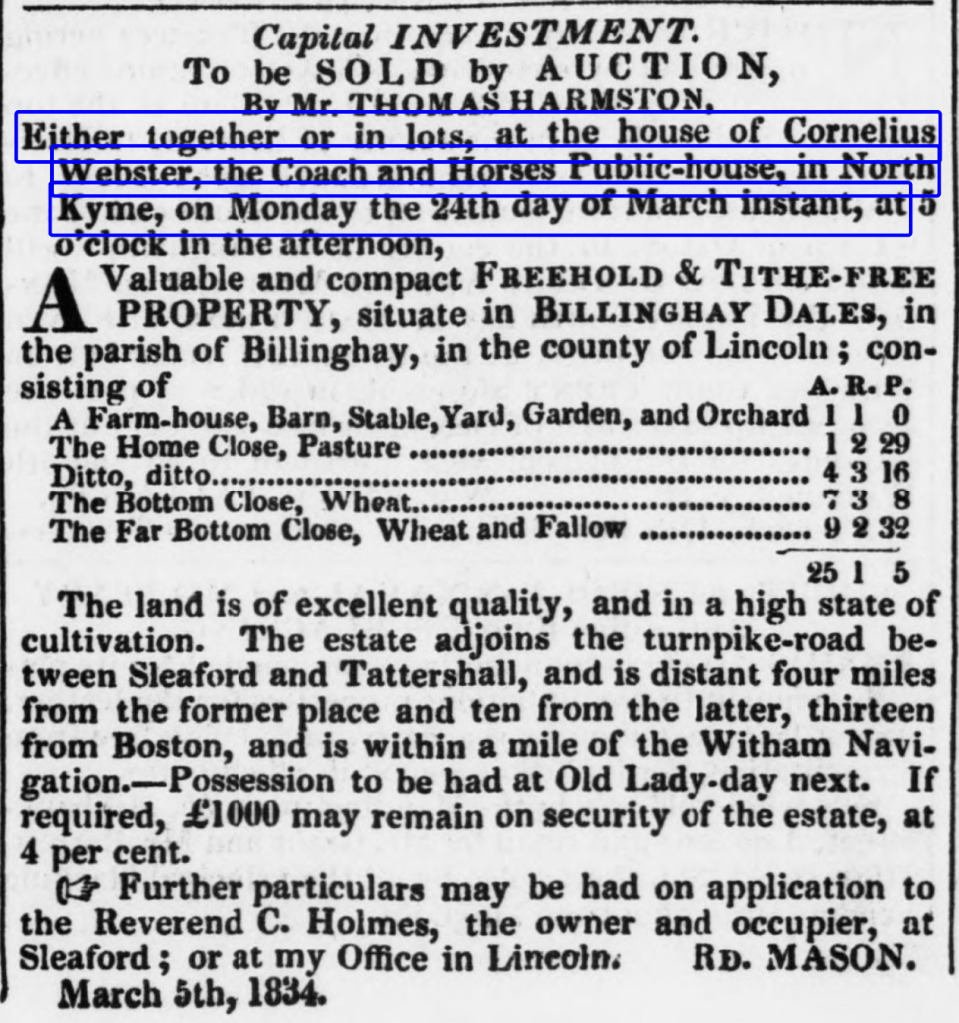 Cornelius Webster, by 1836, had left the Coach & Horses and was a successful farmer in Martin near Billinghay.