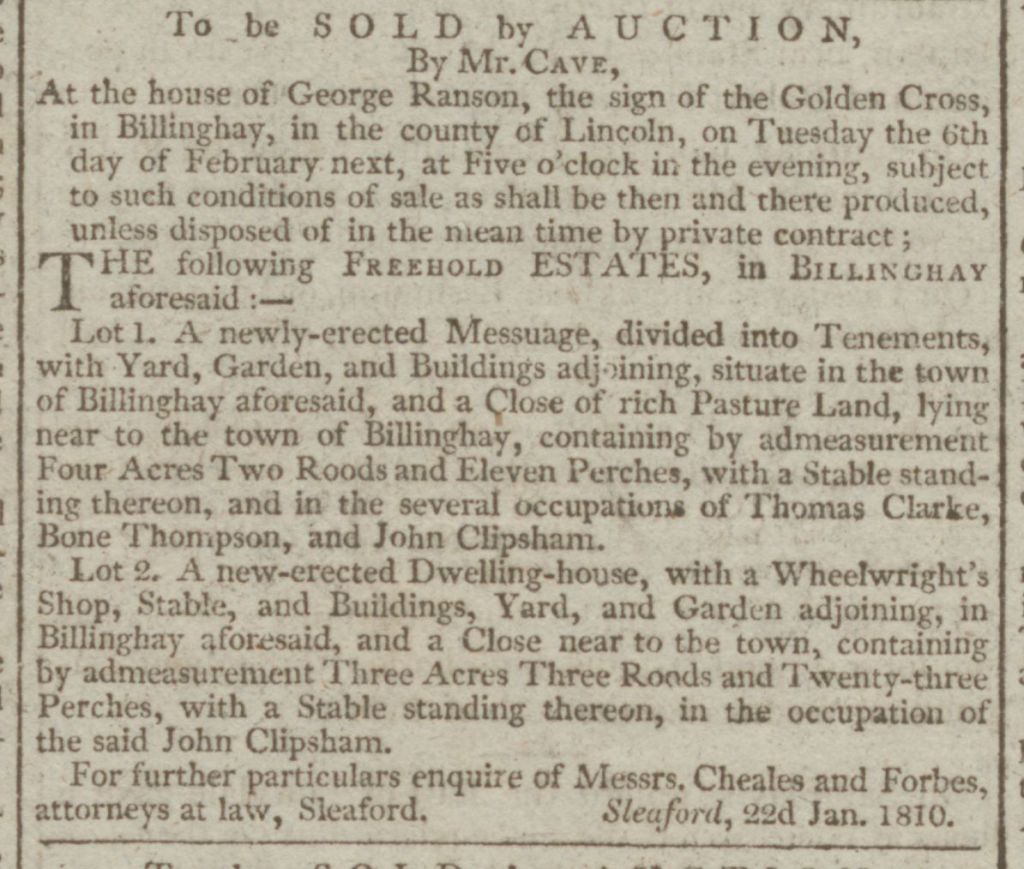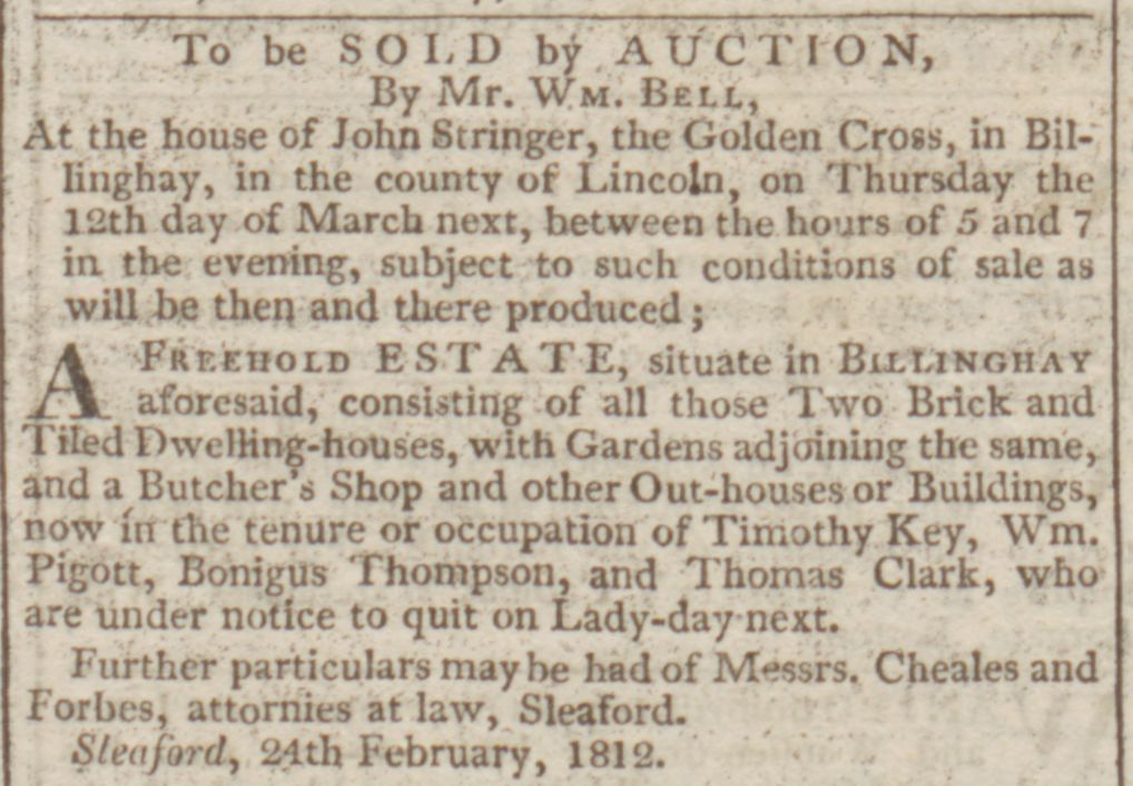 Seven months later, it was reported on 24 December 1813 that John Stringer tried to sell, and the property was put up for auction.