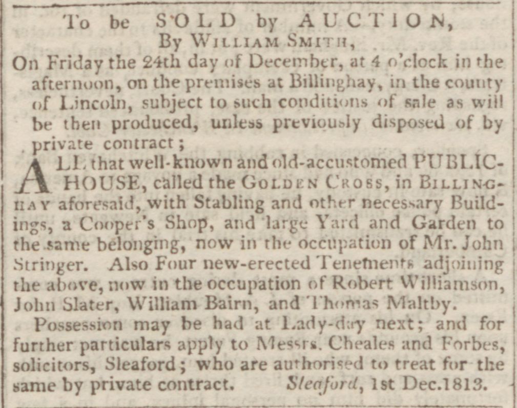 The earliest known reference to the Golden Cross dates to March 1808, when the premises were used for the auctioning of property. This event was advertised in the Stamford Mercury on 18 March 1808. However, the innkeeper was not known at this time.