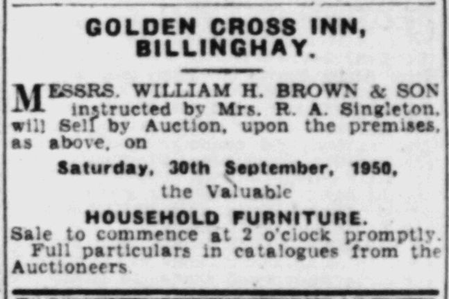 Rose Singleton continued to be the landlady of the Golden Cross until 1950, when she put the pub up for auction. The sale was recorded in the Lincolnshire Standard and Boston Guardian on 9 Sept 1950. The sale also included the household furniture.
