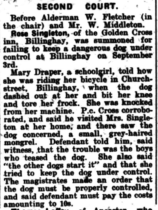 Sleaford Gazette, 26 Sept 1941 – Rose Singleton was in trouble with the law for keeping a dangerous dog. This confirms she was still the licensee at the Golden Cross.