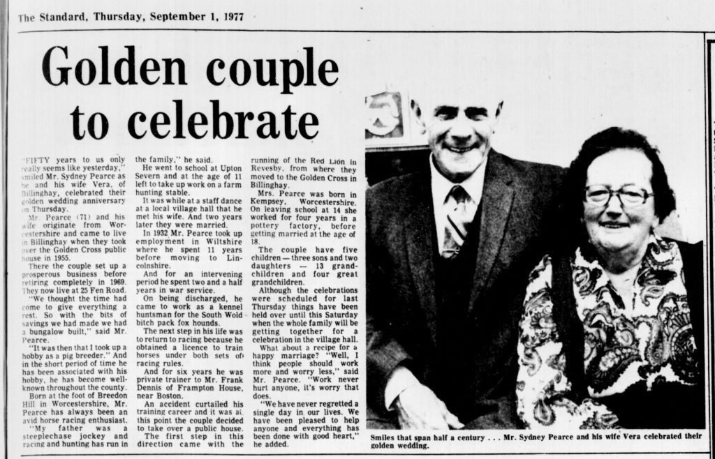 Another newspaper article in the Sleaford Standard, 1 Sept 1977, reports the Golden wedding anniversary of Sidney and Vera Pearce. The article confirms they took over the Golden Cross in 1955 and retired in 1969. What a lovely photo and story of the couple who ran the Golden Cross.
