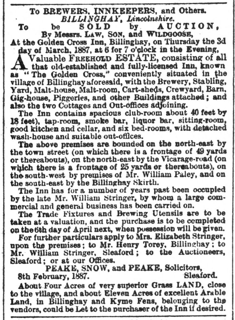 William Stringer died in 7 Jan 1887, following which in Feb 1887 the Golden Cross was put up for auction.