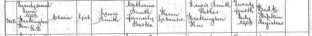 I then found the most likely marriage between a Mr Lewis Smith and a Miss Catherine Barks in 1901, registered in Sleaford, but to be totally sure, I had to order Clara’s digital birth record. I am pleased to say that my hunch was correct.