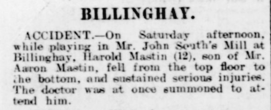 Despite its picturesque appearance, Southās Mill was a dangerous place of work. Windmills contained exposed shafts, gears, and drive belts, with little in the way of safety protection. In 1913, only two years after the postcard was posted, a terrible accident occurred when twelve-year-old Harold Mastin was killed while working at the mill. He had become entangled in the machinery. The incident was widely reported at the time and became part of local memory. I recall my father telling me the story. It stands as a stark reminder that behind the tranquil postcard image lies a hazardous and unforgiving industrial environment.