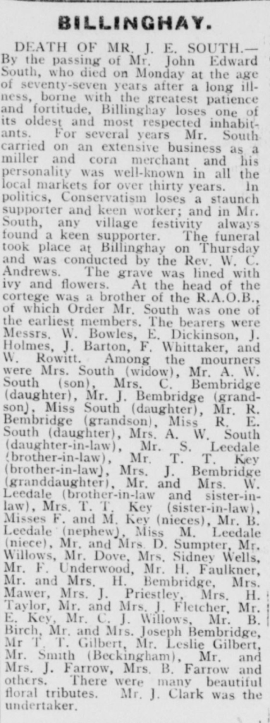 John Edward Southās death was reported in the Lincoln Leader and County Advertiser on 29 June 1929, and the obituary provides a vivid insight into his standing within the community of Billinghay. Described as one of the villageās āoldest and most respected inhabitants,ā South is presented not merely as a tradesman but as a central and well-known figure in local life.
